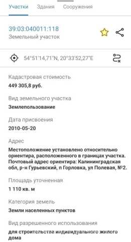 Продам участок по адресу р-н Гурьевский, п Горловка, ул. Полевая 2. Кадастровый номер 39:03:040011:118
