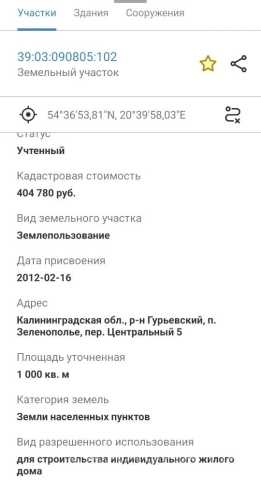 Продам участок по адресу р-н Гурьевский, п. Зеленополье, пер. Центральный 5. Кадастровый номер 39:03:090805:102